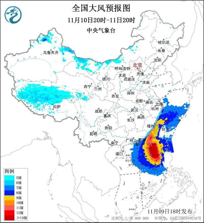 预计,11月9日20时至10日20时,新疆北部、内蒙古中东部、河北北部、黑龙江东部、辽东半岛、山东半岛、西藏西部和北部、青海西南部、广东东部沿海、福建沿海、台湾岛南部等地有5~6级、阵风7~8级的大风;黄海北部和中部海域、东海南部海域、台湾海峡、巴士海峡、台湾以东洋面、南海北部和中部海域将有7~8级、阵风9~10级的大风,其中台湾海峡、巴士海峡、南海东北部和中东部的部分海域风力可达9~11级、阵风12~13级,台风“凤凰”中心经过的附近海域风力有12~14级,阵风15~16级。